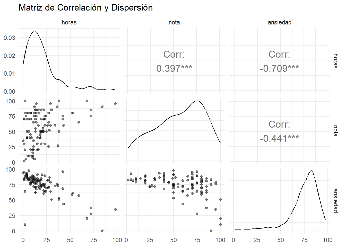 Para la correlación, la visualización es el paso más importante para verificar el supuesto de linealidad. Una matriz de gráficos de dispersión es la herramienta perfecta.