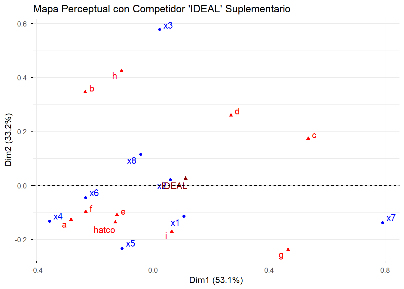 labs(title = "Mapa Perceptual con Competidor 'IDEAL' Suplementario")