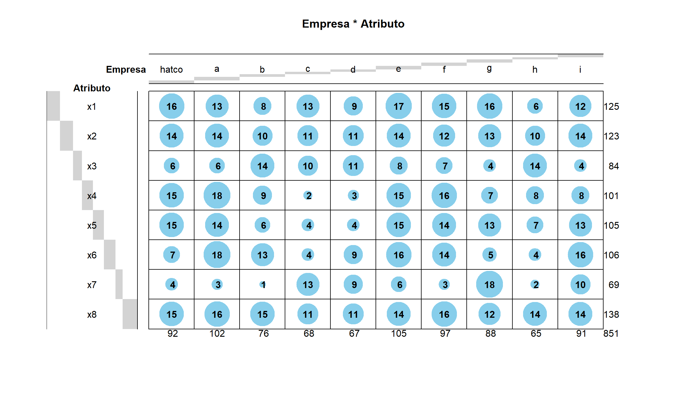 Contexto: HATCO, una empresa de maquinaria industrial, quiere entender su posición competitiva. Ha realizado un estudio donde se ha preguntado a clientes qué atributos (X1 a X8) asocian con HATCO y sus 9 principales competidores (A a I). El resultado es una tabla de contingencia que muestra la frecuencia con la que cada empresa ha sido asociada con cada atributo.