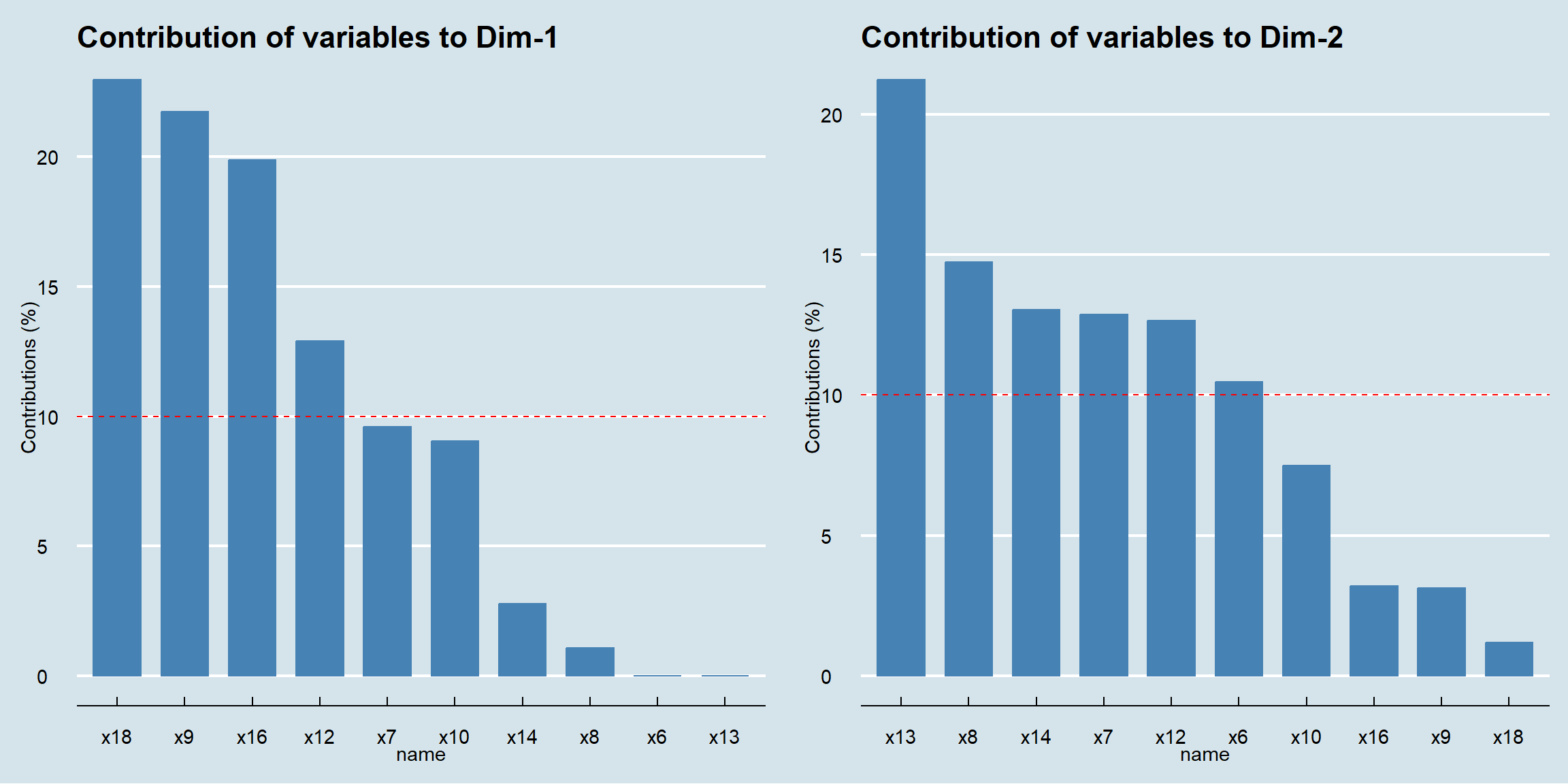 Finalmente, podemos visualizar qué variables contribuyen más a la creación de cada una de las dimensiones. Esto nos ayuda a confirmar el nombre que le dimos a cada componente.